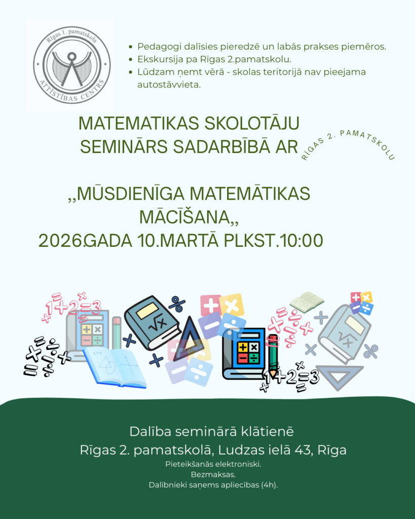 Aicinām Jūs piedalīties Rīgas 1.pamatskolas-attīstības centra, sadarbībā ar Rīgas 2.pamatskolu, organizētajā matemātikas skolotāju seminārā