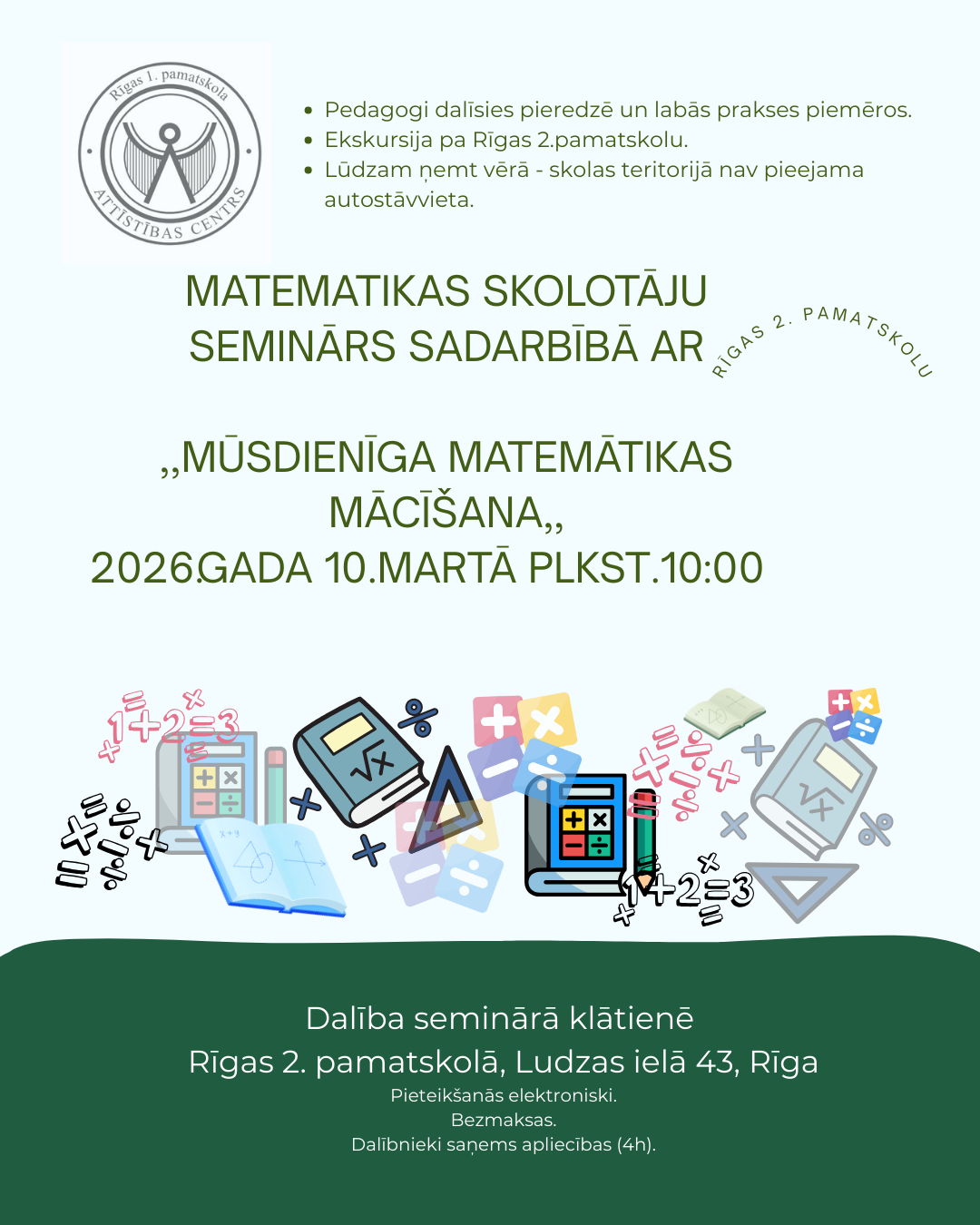 Aicinām Jūs piedalīties Rīgas 1.pamatskolas-attīstības centra, sadarbībā ar Rīgas 2.pamatskolu, organizētajā matemātikas skolotāju seminārā